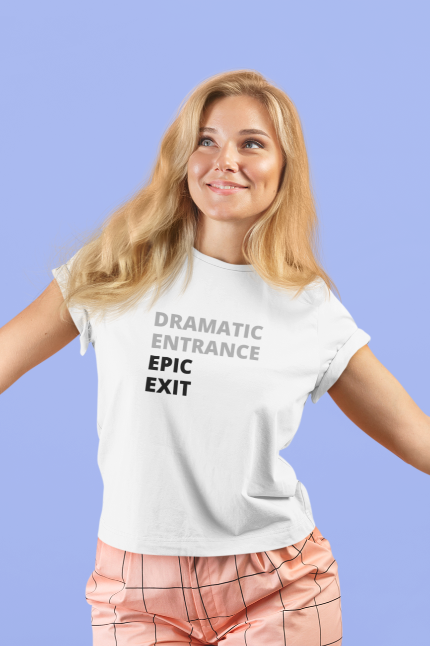 Make a statement both on and off stage with our "Dramatic Entrance, Epic Exit" T-Shirt! Perfect for theater lovers and performers who know that every moment on stage deserves to be memorable, this tee celebrates the art of creating unforgettable entrances and exits.