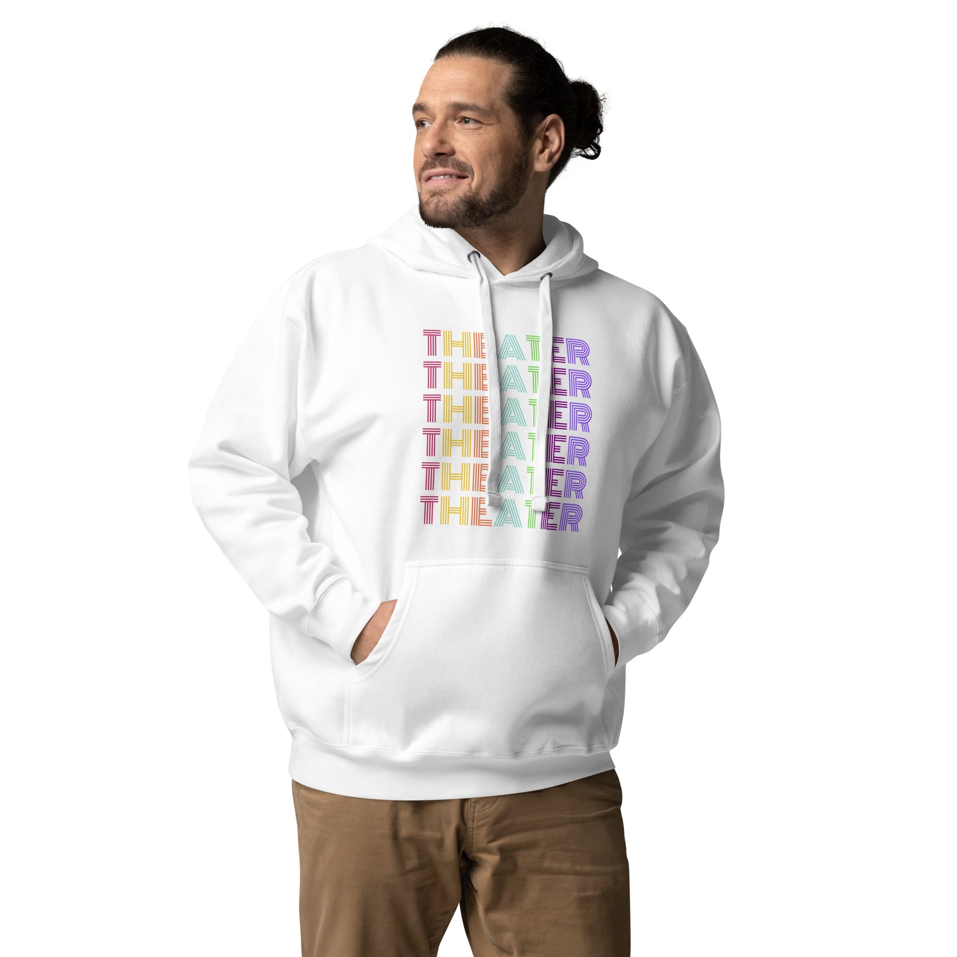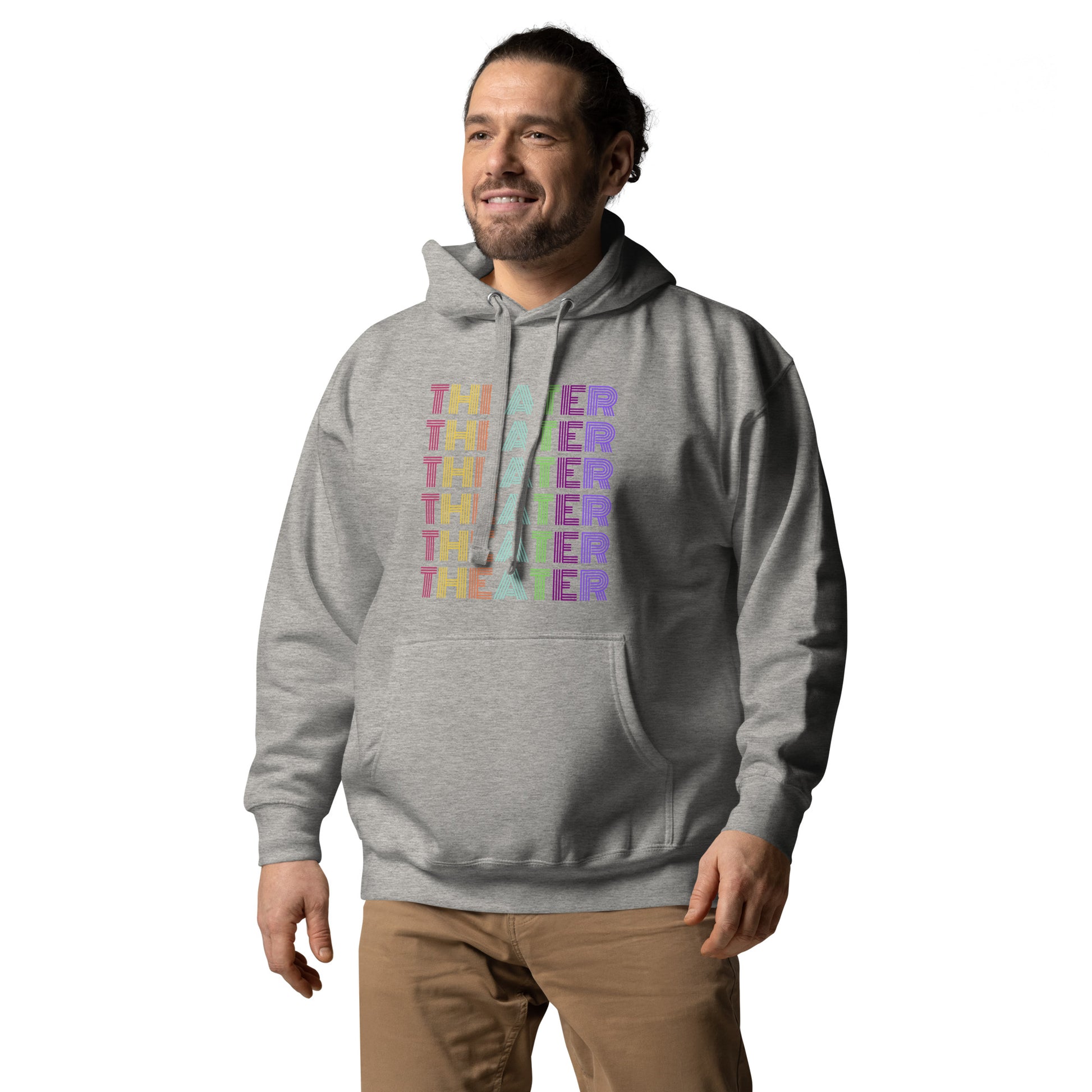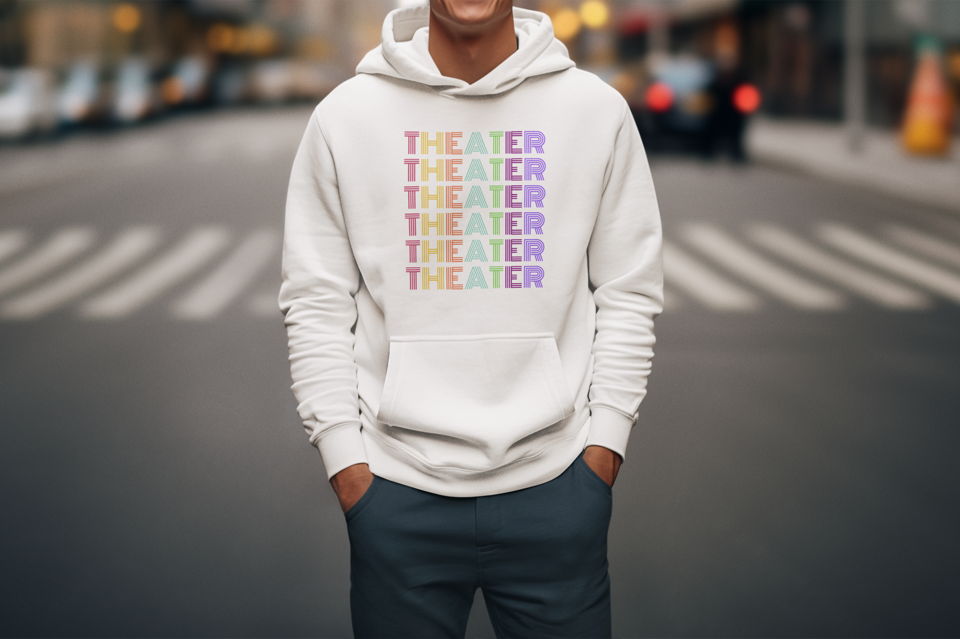 Theater Hoodie with Multicolored Text, Musical Gift Play, Theater Lover Apparel