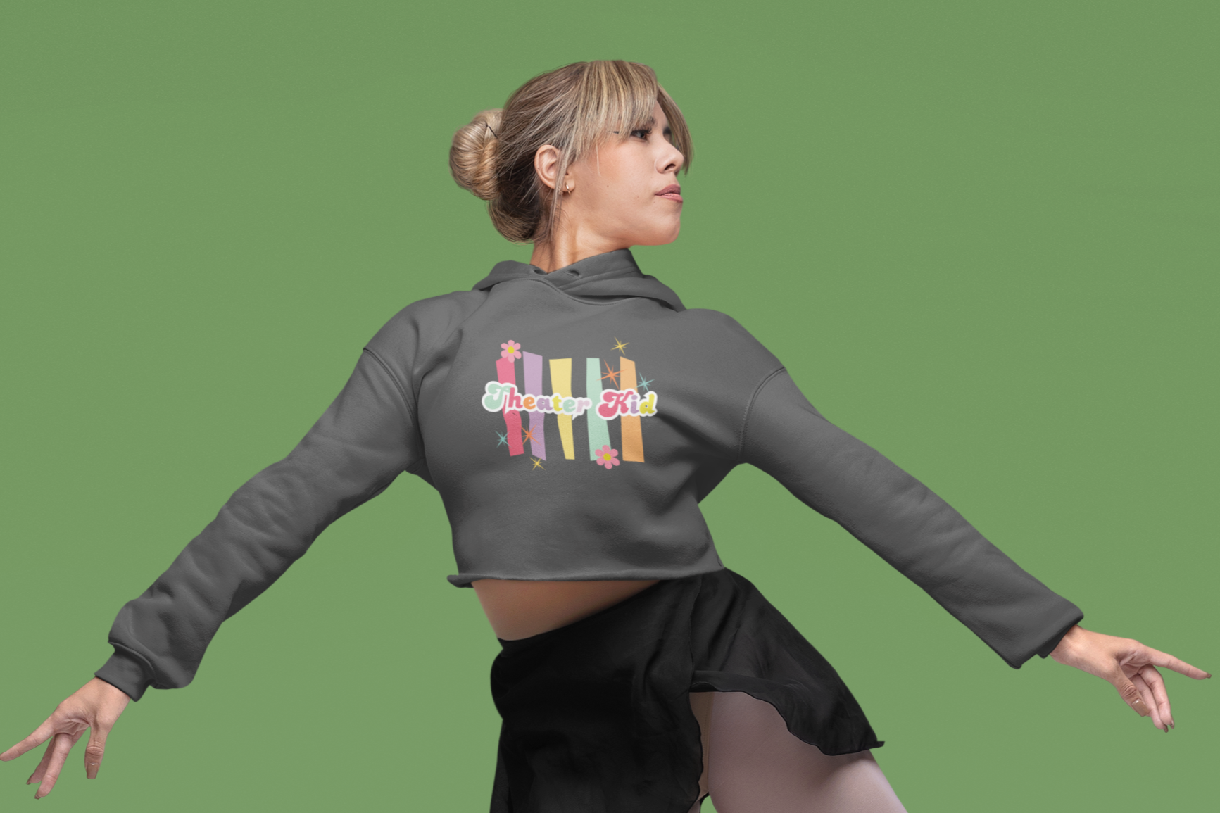 Celebrate your theatrical spirit with our "Theater Kid" Crop Sweatshirt! This playful and stylish sweatshirt is designed for anyone who’s ever lost themselves in the magic of the stage, from backstage rehearsals to front-row performances