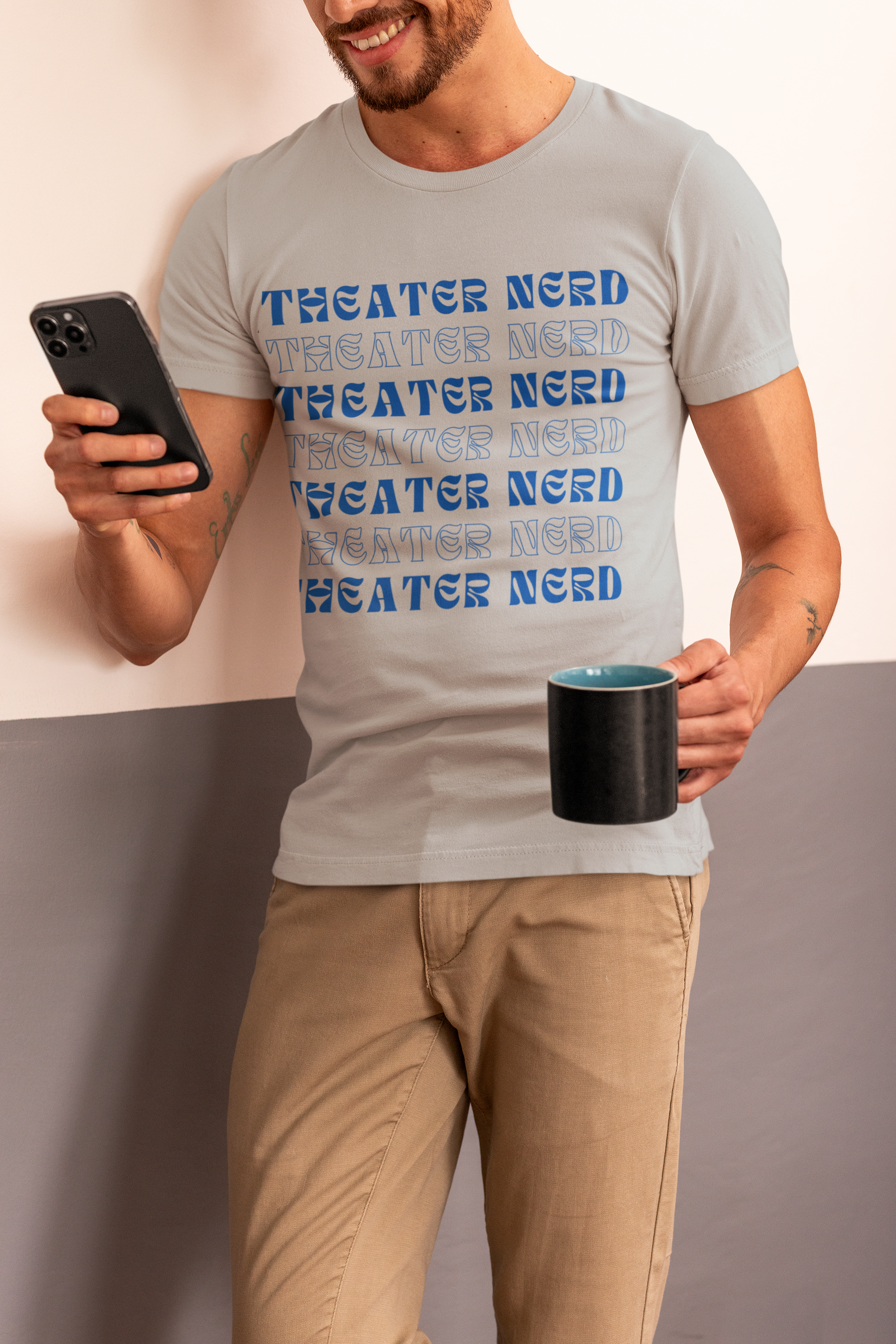 Embrace your theatrical obsession with our "Theater Nerd" Repeated Pattern T-Shirt! This tee is a playful celebration of your love for the stage, featuring a bold, all-over print that proudly announces your theater nerd status.